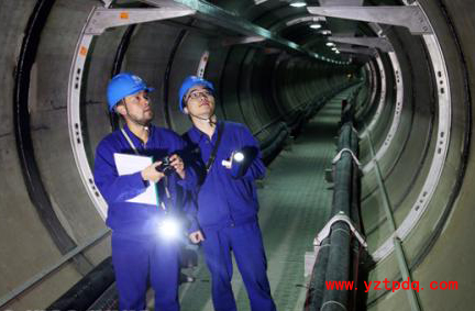 圖為工程驗(yàn)收人員正在新落成的“電纜隧道”內(nèi)進(jìn)行驗(yàn)收。