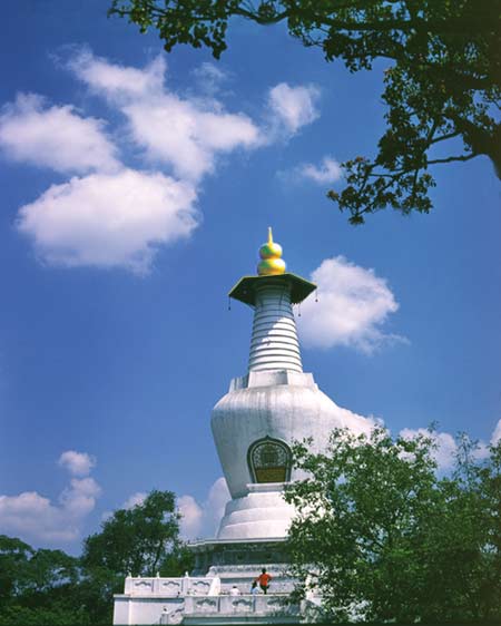 揚(yáng)州的白塔高 27.5 米 ,下面是束腰須彌塔座,八面四角,每面三龕,龕內(nèi)雕刻著十二生肖像。和北海白塔的厚重穩(wěn)健不同,揚(yáng)州白塔比例勻稱,玉立亭亭。和身邊的五亭橋相映成趣。