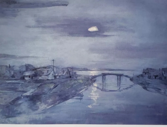 這是家鄉(xiāng)的夜景,冷冷的月亮高高地掛在天上,村莊靜悄悄的籠照在月光下,安詳而充滿神秘,令我神往。這是我畫中的“家”,是我心中的“家”,也是我永遠回不去的“家”。