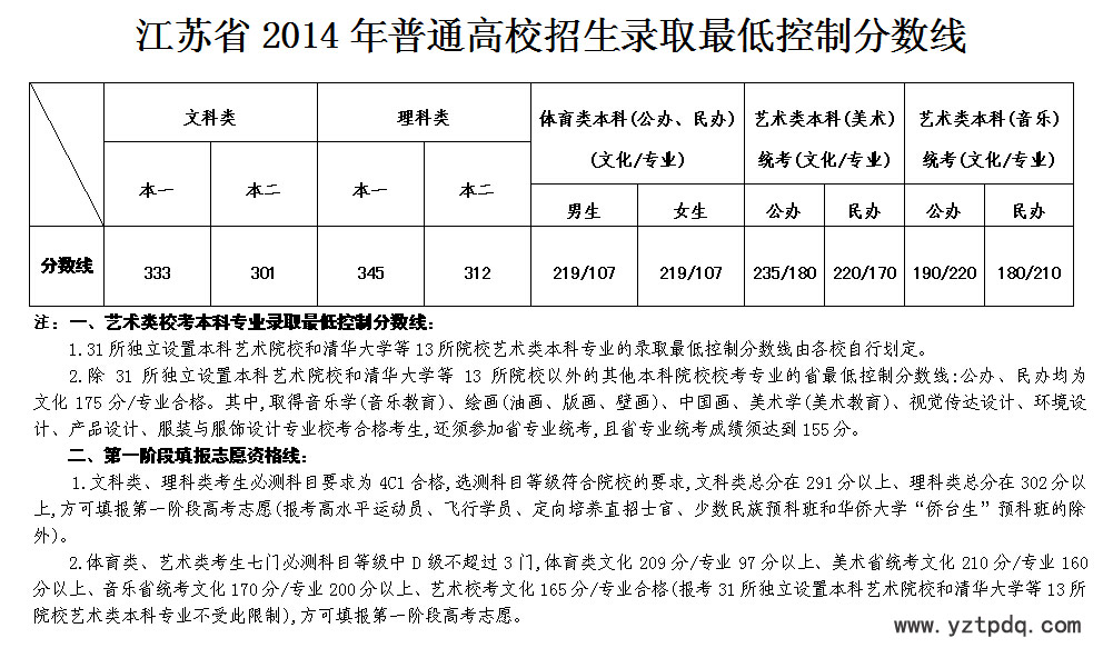 2014年6月24日下午,江蘇省高校招生委員會(huì)召開(kāi)會(huì)議,審議通過(guò)了2014年江蘇省普通高校招生第一階段錄取各批次省最低控制分?jǐn)?shù)線。其中,文科:一本333、二本301;理科:一本345、二本312;藝術(shù)(文化/專業(yè))公本235/180、民本220/170; 體育(文/專)男219/107、女219/107。